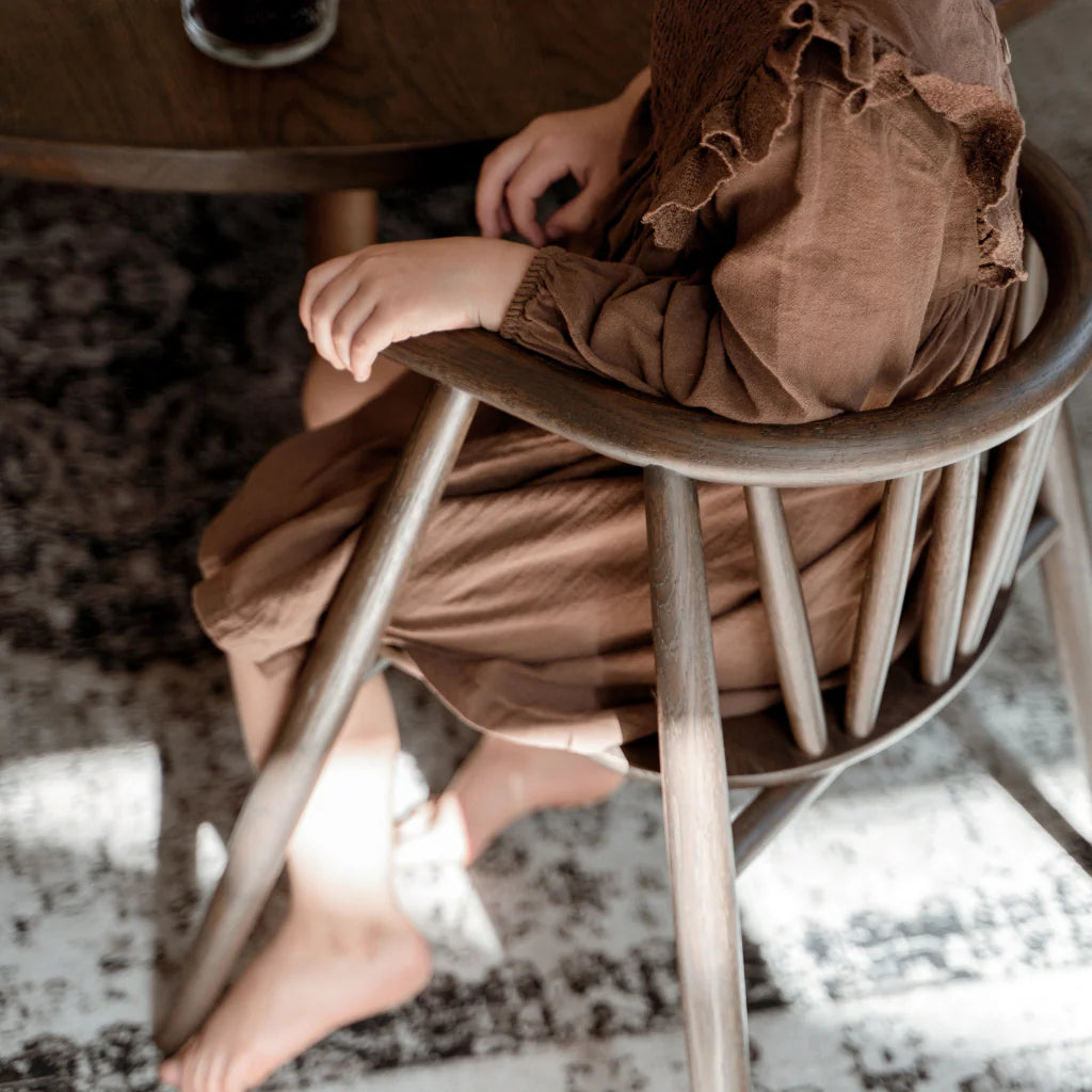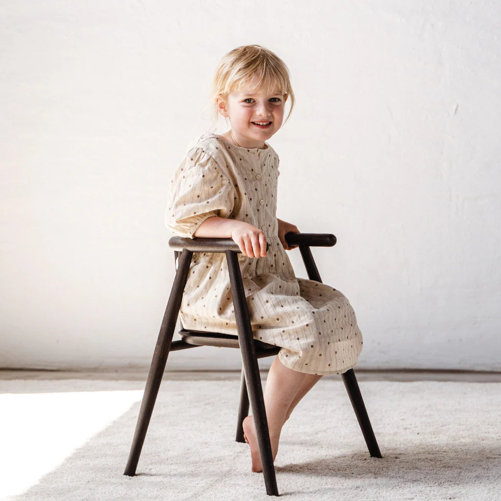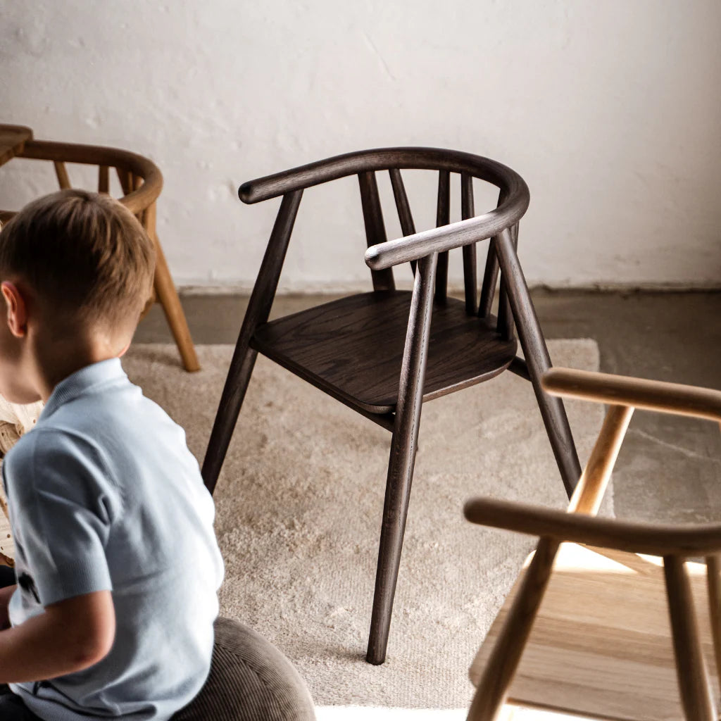 Oaklings Storm børnestol i røget eg er designet af Nina Bruun i 2021 og repræsenterer et moderne bud på en fremtidig dansk designklassiker. Med sin kombination af funktionalitet, æstetik og kompromisløst håndværk er Storm et smukt supplement til hjemmets øvrige møbler.