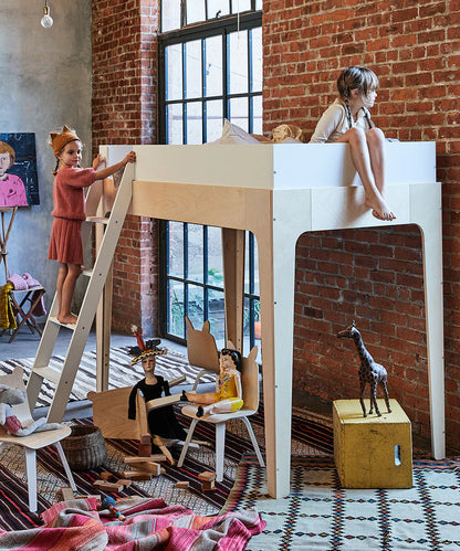 Perch højsengen fra Oeuf NYC udnytter højden i rummet og skaber plads til mere leg, ro og kreativitet. Den hævede soveplads giver mulighed for en hyggelig læsekrog, et lille skrivebord eller et legeområde nedenunder – perfekt til børneværelser, hvor hver kvadratmeter tæller.