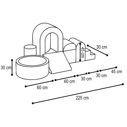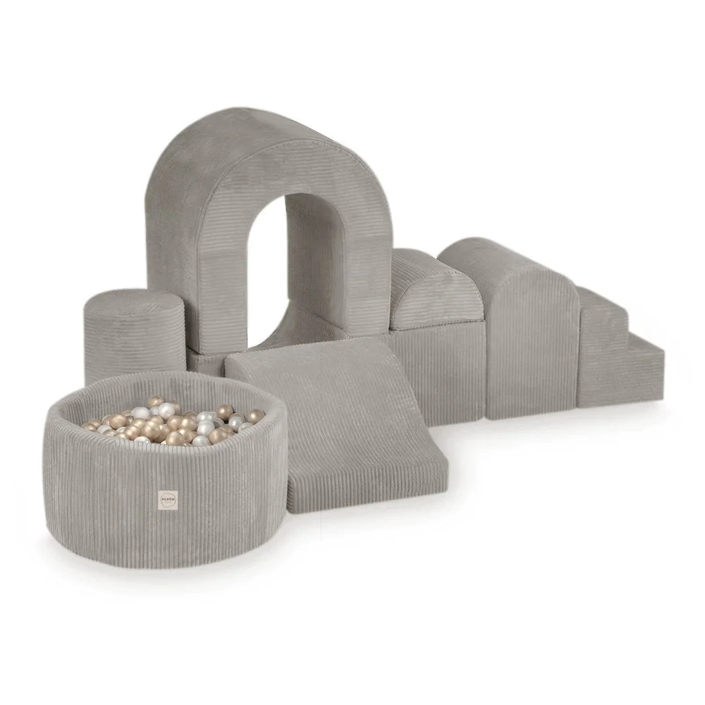 Skab et magisk legerum derhjemme med Plush Nest Stort tumlesæt i skum med stort boldbassin. Beklædt med blød og slidstærk beige fløjl kombinerer dette tumlesæt både komfort og funktionalitet. Her kan barnet tumle, gemme sig og dykke ned i boldbassinet med 150 bolde i elegante perlemors- og guldfarver.