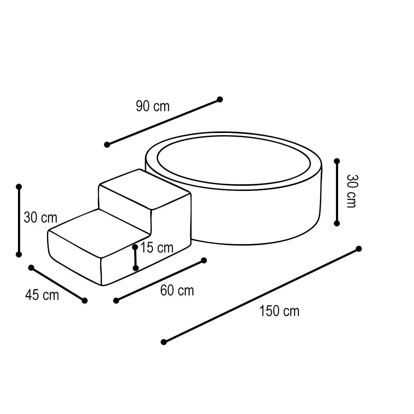 - Skumtrappe: Perfekt til at styrke balance og motorik, mens barnet trygt kan komme ind og ud af boldbassinet (mål: 45 cm x 60 cm x 30/15 cm).