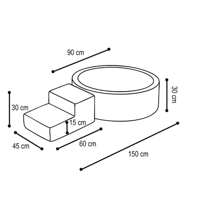 Sættet består af et rummeligt boldbassin med bolde og en blød skumtrappe, der gør det nemt og sjovt for barnet at komme op og ned fra bassinet. Betrækket er fremstillet i premium bred fløjl – et ekstra blødt og hudvenligt materiale, der giver en følelse af komfort og tryghed, selv for de mest sarte kinder.