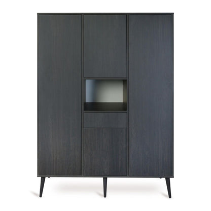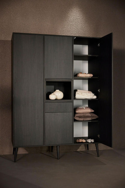 Med målene 142,5 x 58 x 196,5 cm får du en imponerende mængde opbevaringsplads, samtidig med at skabet står let i rummet. Basen i massivt bøgetræ tilføjer varme og stabilitet og spiller smukt sammen med den dybe Eboni-tone.