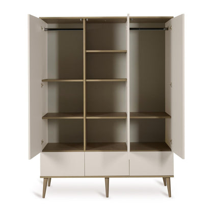 Med målene 144 x 58 x 196 cm får du en rummelig garderobe med plads til det hele. Indvendigt finder du seks justerbare hylder og to bøjlestænger, som giver fleksibilitet til både tøj, tilbehør og opbevaringskasser. Nederst er skabet udstyret med tre skuffer, som åbnes med push-to-open systemet – præcis som de tre døre, der giver et glat og harmonisk frontudtryk.