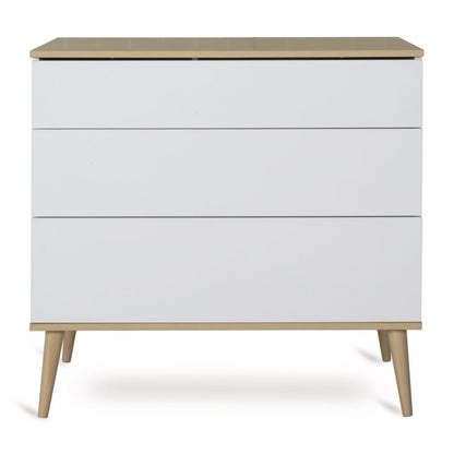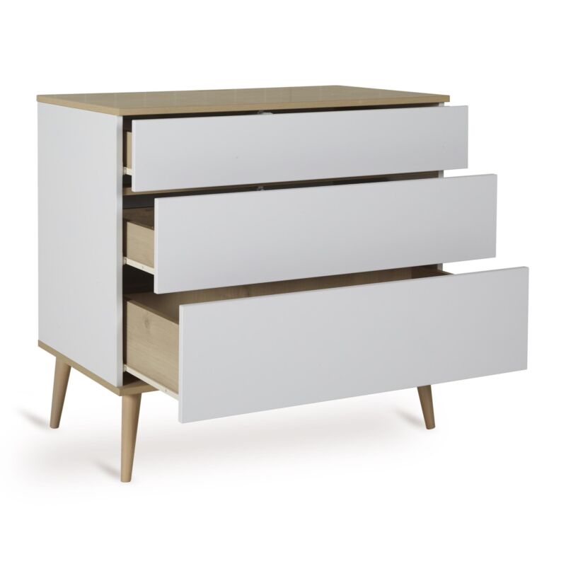Kommoden har tre rummelige skuffer, som åbner stille og let med push-to-open systemet. Det giver en praktisk hverdag, hvor du nemt kan få fat i alt fra tøj og bleer til sengetøj og småting, også når du har barnet på armen.