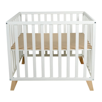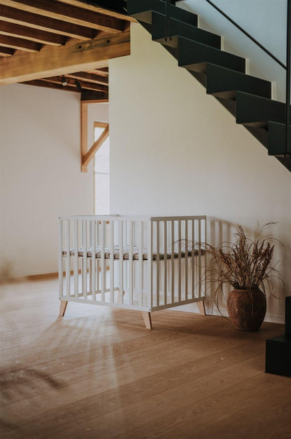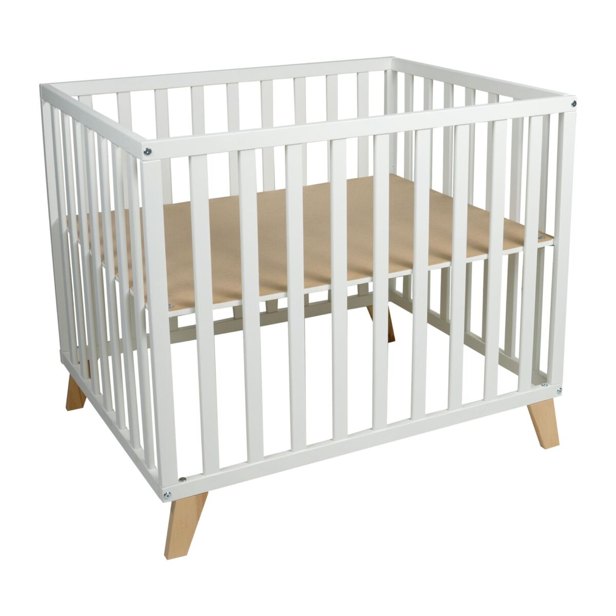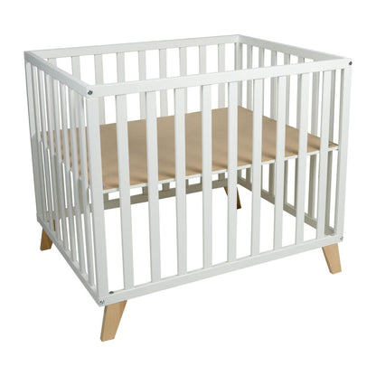 Kravlegården er fremstillet i MDF af høj kvalitet og behandlet med en vandbaseret lak, der lever op til EN 71-3-standarden – helt fri for skadelige stoffer. Bunden kan justeres i tre højder, så du nemt kan tilpasse den til barnets udvikling og behov.