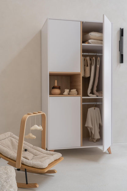 Skabet har tre svinglåger med push-åbning, som giver et glat og minimalistisk design. Indvendigt finder du tre faste hylder, tre justerbare hylder og to bøjlestænger, så du nemt kan tilpasse opbevaringen efter barnets alder og behov. Derudover har skabet et åbent rum med indvendige mål 45 x 30 x 56 cm – perfekt til kurve, bøger eller små dekorative ting.