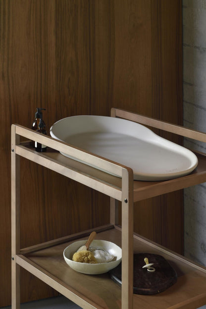 Mamee puslepuden er skabt til de øjeblikke, hvor ro, tryghed og nærvær betyder allermest. Den har fået sit navn fra det japanske ord “Mame” – bønne – som symboliserer vækst og omsorg. Formen er derfor blød og afrundet, så baby ligger naturligt og komfortabelt under hele puslestunden.