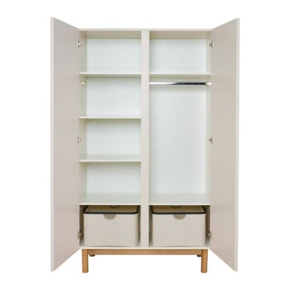 Bag de to låger finder du masser af praktisk opbevaringsplads. Skabet åbnes med et push-to-open system, så der ikke er brug for håndtag, og indeni er der både tre hylder og en bøjlestang – perfekt til at holde styr på barnets tøj, sengetøj og små favoritter.