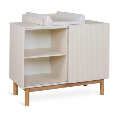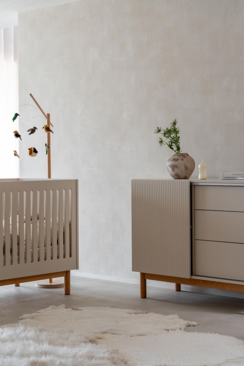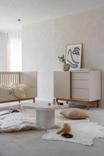 Quax Mood kommode i farven Clay er et smukt og funktionelt møbel, der kombinerer rene linjer, harmonisk design og praktisk hverdagsopbevaring. Med en rummelig låge og tre skuffer får du masser af plads til tøj, bleer og alle de små ting, der hører hverdagen med en baby til.