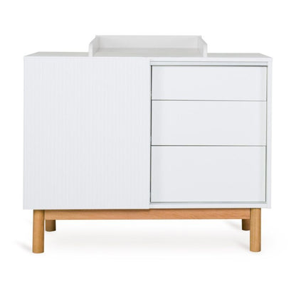 Quax Mood kommode i farven White er et stilrent og funktionelt møbel, der kombinerer minimalistiske linjer med praktisk hverdagsopbevaring. Med én låge og tre rummelige skuffer er der god plads til både tøj, bleer og alt det, der hører babyhverdagen til.