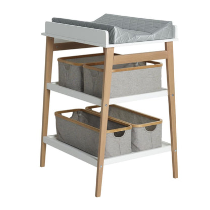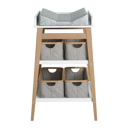 De to faste hylder giver god plads til bleer, vaskeklude, skiftetøj og alle de små ting, du gerne vil have lige ved hånden. Puslebordet kan desuden udstyres med kurve i de tilpassede mål, hvis du ønsker endnu mere organiseret opbevaring.
