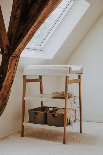 Quax Hip puslebord i Hvid/Natur er et enkelt, stabilt og moderne puslebord, der gør pusletiden nem og overskuelig. Det er fremstillet i solid MDF og massivt bøgetræ og behandlet med en trelags lak, testet efter EN 71-3, så du får et møbel, der både er sikkert og holder sig smukt i mange år.