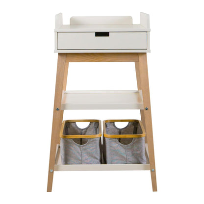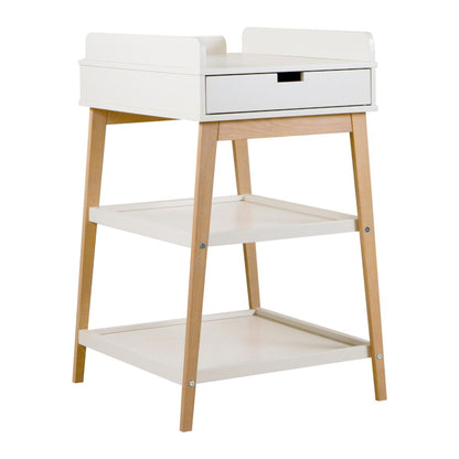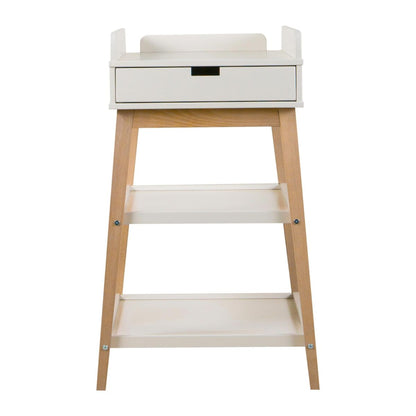 Puslebordet er fremstillet i MDF og massivt bøgetræ og giver en stabil og tryg base i hverdagen. De to faste hylder giver god plads til bleer, tekstiler og de ting, du bruger igen og igen. Den rummelige skuffe hjælper med at samle de små nødvendigheder, så du altid har det vigtigste lige ved hånden.