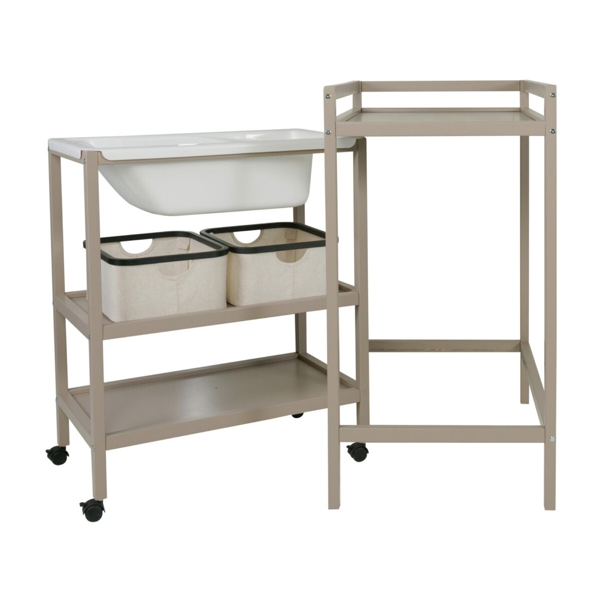 Puslebordet leveres med et fuldt mobilt badekar, som du nemt kan køre hen til håndvasken eller et andet praktisk sted, når det skal fyldes. Når badet ikke længere er nødvendigt i hverdagen, kan det tages helt af – og bordet fungerer herefter som et klassisk, tidløst puslemøbel.