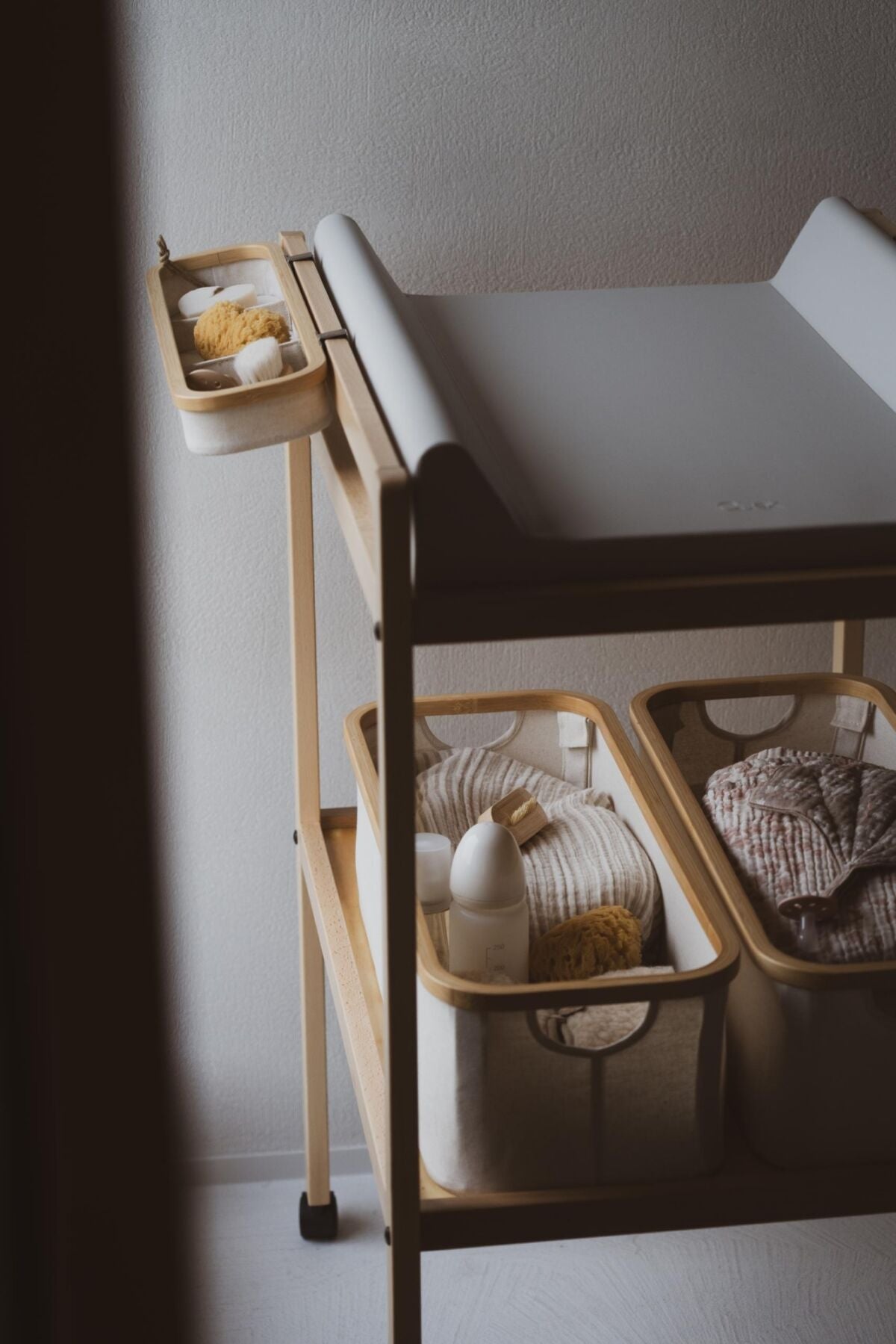 Du har mulighed for at tilkøbe de smarte hængekurve, som skaber ekstra opbevaring uden at fylde i rummet. De holder bleer, klude og små nødvendigheder lige ved hånden, samtidig med at puslepladsen bevarer sit rene og enkle udtryk.
