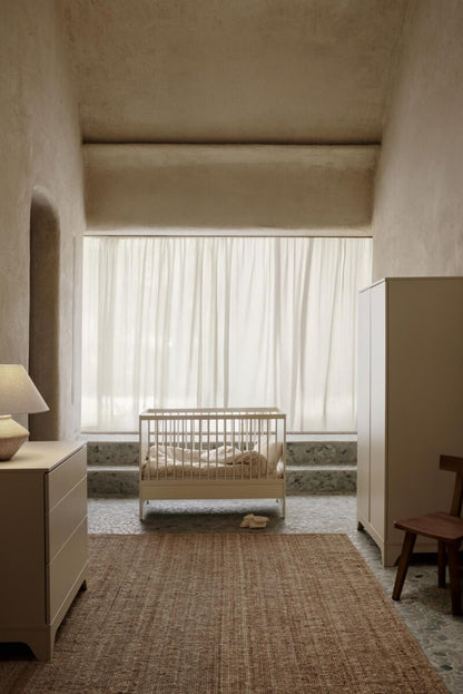 Indvendigt rummer skabet tre justerbare hylder og to bøjlestænger, så du både kan hænge og folde tøj, opbevare småting eller skabe et fleksibelt system, der følger barnets udvikling. De afrundede former og den monokrome farvepalet giver skabet en tidløs elegance, som skaber ro og balance i rummet.
