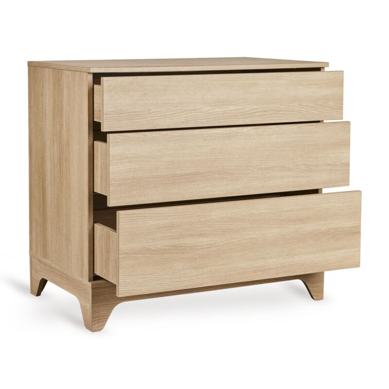 Quax Tsugi kommode i Honey Ash kombinerer bløde linjer, rolige farvetoner og praktisk funktionalitet i et elegant design. De tre skuffer uden håndtag åbner let med push-to-open systemet, og giver god plads til både tøj, udstyr og hverdagens babyting.