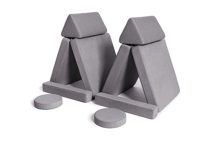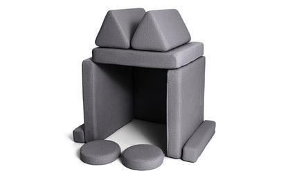 Fire sædehynder (to og to syet sammen), to trekantede ryglæn, to armlæn og to runde puder – alt sammen designet til at give komfort, støtte og kreativ frihed i legen.