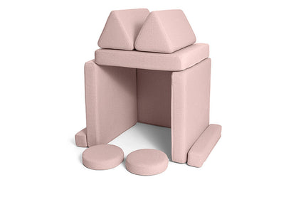 Fire sædehynder (to og to syet sammen), to trekantede ryglæn, to armlæn og to runde puder – alt sammen designet til at give komfort, støtte og kreativ frihed i legen.