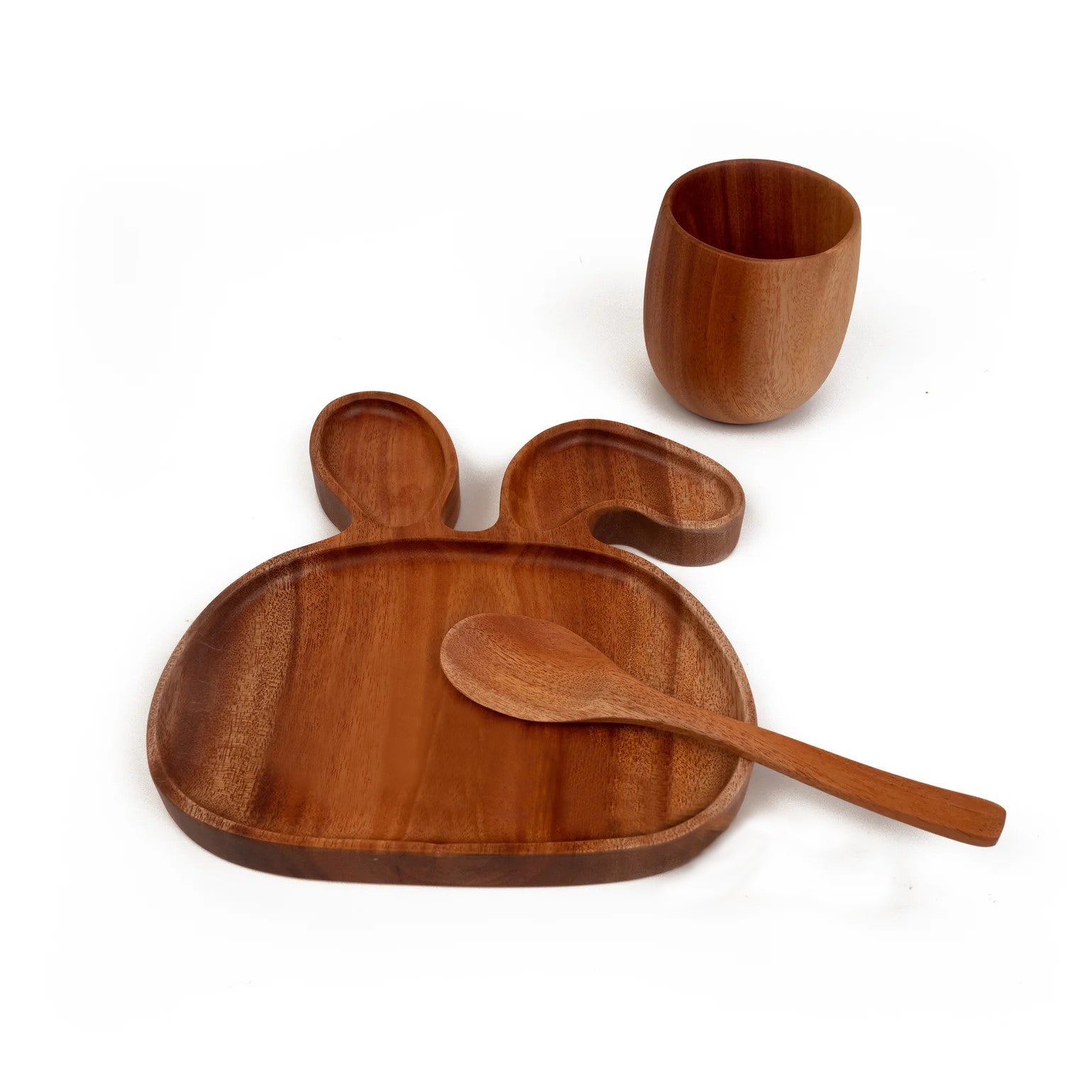 Et smukt startsæt til små spiseeventyr. Dette spisesæt i khayatræ samler tre favoritter i ét: en sød håndlavet børnetallerken (med kaninmotiv), en lille drikkekop og en blid ske – alt sammen skabt til små hænder og store måltider. Perfekt som gave eller som et naturligt alternativ til plastikservice i hverdagen.