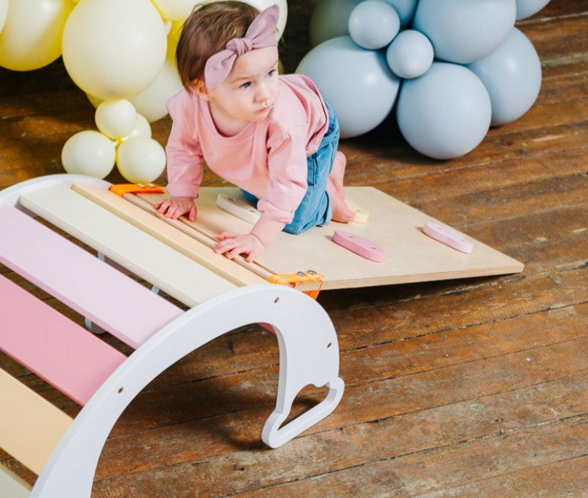 Den er dobbeltsidet: på den ene side finder barnet fire klatregreb, der styrker motorikken og udfordrer balancen, mens den anden side kan bruges som en glat rutsjebane. På den måde får barnet både sjov, træning og kreativ udfoldelse i ét.