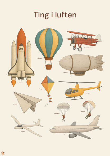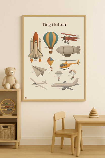 En lærerig og legende plakat med alt det, der kan flyve! Fra luftballon og rumraket til papirfly og drage – her får dit barn en visuel introduktion til luftens fartøjer.