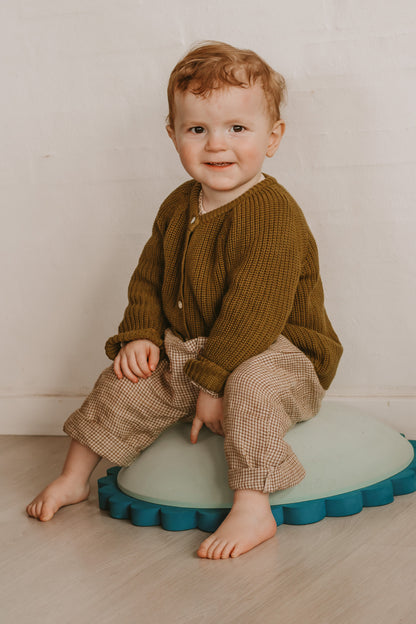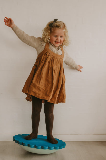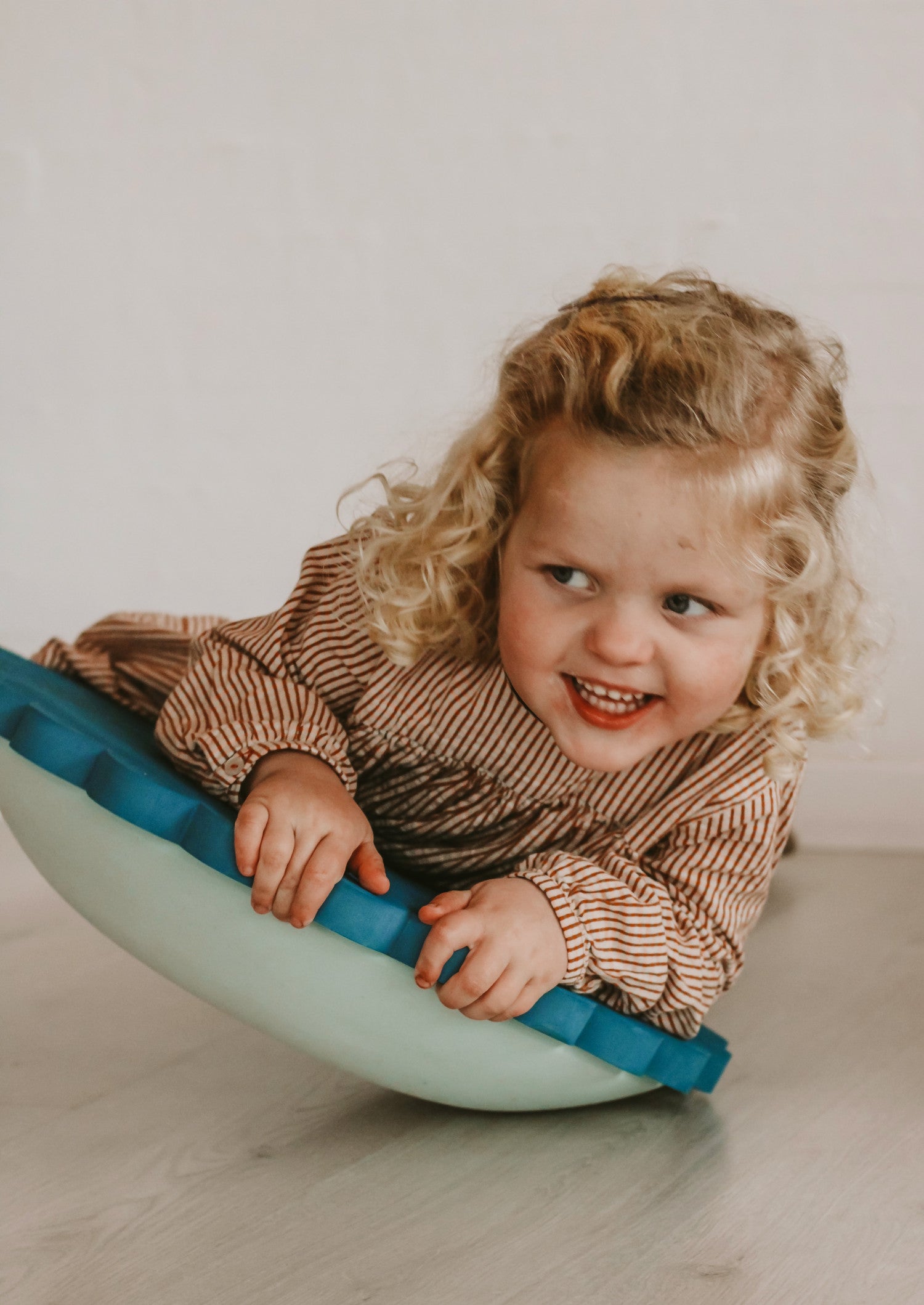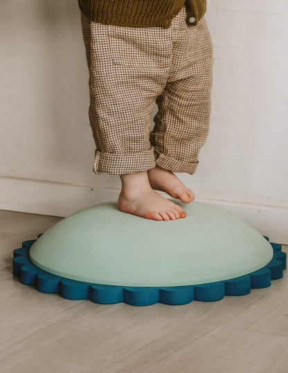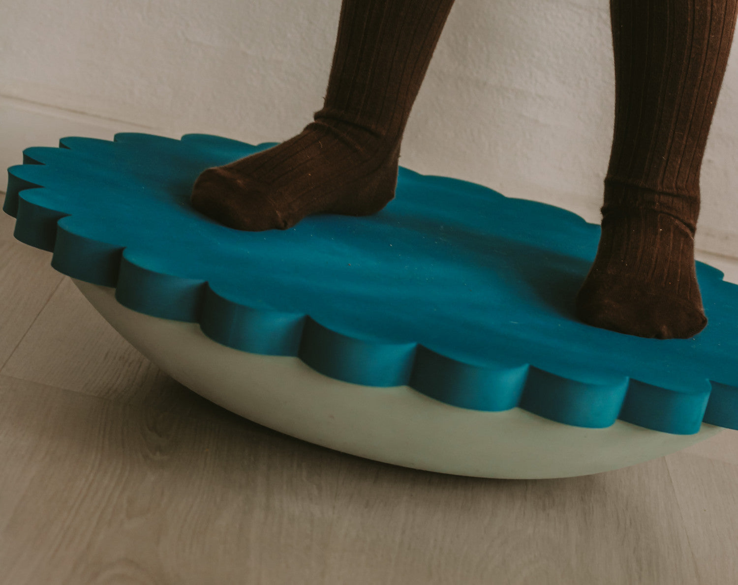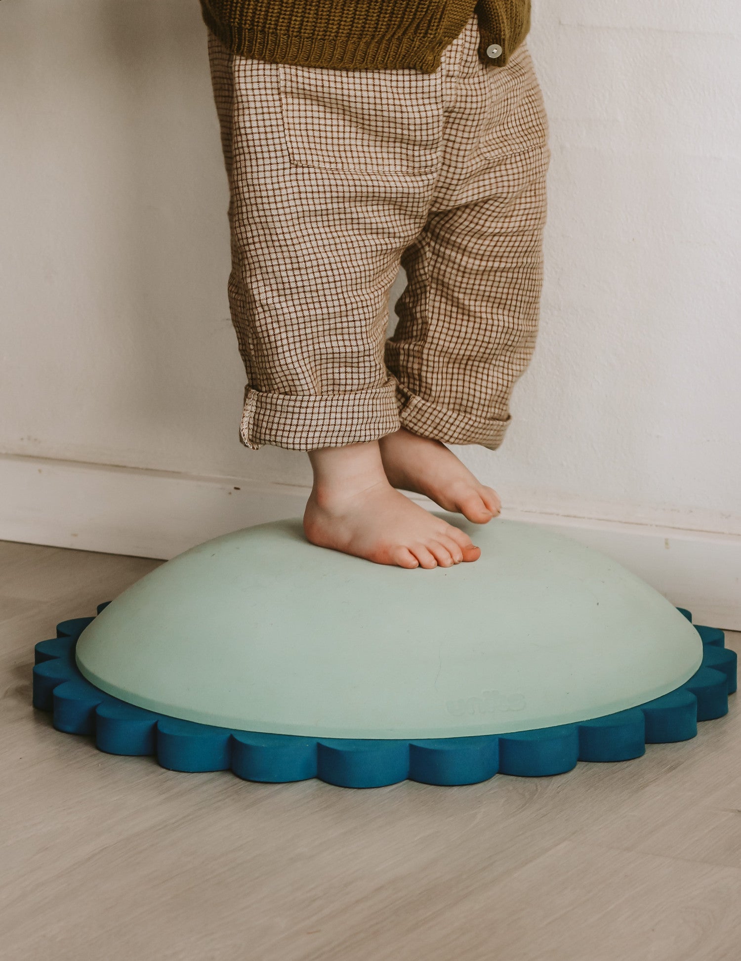 Den blå blomst fra Units er et motorisk redskab, der gør det sjovt at træne balance. Med sin store, runde overflade kan babyer ligge på maven og opleve en blid gyngetur eller en fornemmelse af at snurre rundt som på en karrusel. For større børn er blomsten ideel til at stå på, når balancen skal udfordres.