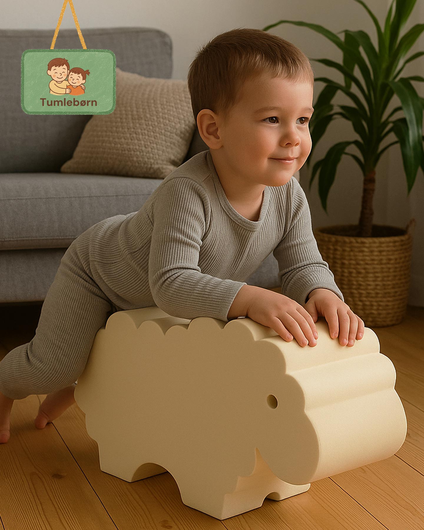 Kan barnet kravle op på fåret, når det ligger på siden? Tør det tage en ridetur, eller kan de større børn holde balancen, når fåret vipper på ryggen? Fåret indbyder til mange forskellige øvelser, der kan tilpasses barnets alder.